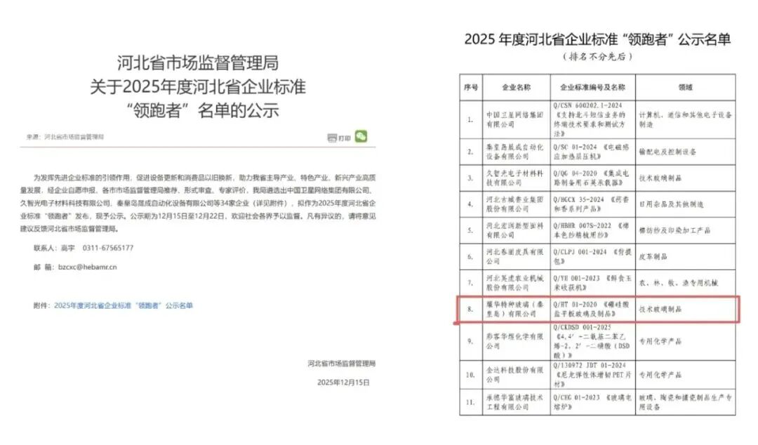 近期,河北省市场监督管理局公示2025年度河北省企业标准“领跑者”名单,耀华特玻秦皇岛凭借在标准创新、技术指标先进性、质量管控及产业引领等方面的实力成功入选,体现了相关领域标准制定的领先性、技术指标的优越性和产业开展的导向性,是企业核心竞争力与行业话语权的体现。此次入选,是对耀华特玻秦皇岛深耕特种玻璃细分领域、坚持标准化开展的肯定。